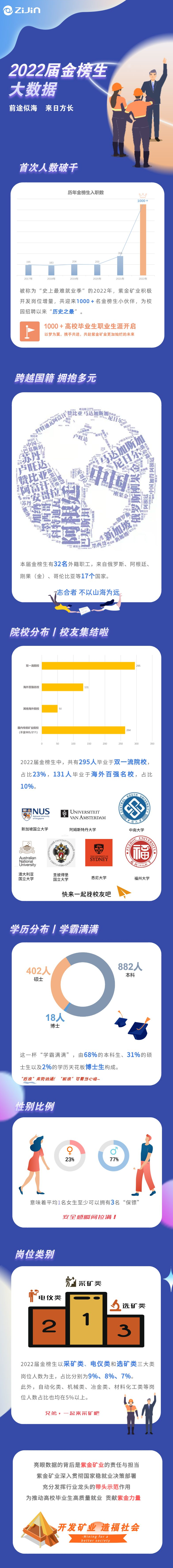 公司于2017年提出“金榜生”计划,面向全球招聘高素质毕业生,目前在职“金榜生”815人,其中近100人在境外任职。2022年,“金榜生”升级为“英才千人”计划,招录了来自全球17个国家近1300名应届毕业生,其中,外籍和有海外留学背景及国内高校语言类专业毕业生269人、占比20%,博士和硕士学历毕业生420人、占比31%。