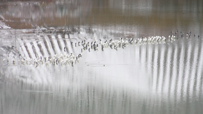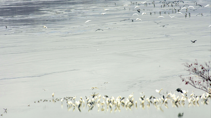 本网讯 10月21日上午,珲春紫金曙光金铜矿迎来今冬第一场小雪,雪花犹如征蓬纷纷扬扬飘舞。而伴随这场小雪一起来到的,还有千百余只野生候鸟,主要品种有白鹭、大雁、野鸭等。它们在矿山二期尾矿库区或驻足栖息,或在滩面上嬉戏,或在空中盘旋飞舞,场面十分壮观。