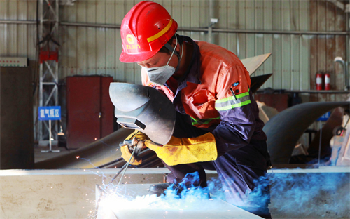 图为机雷俊明正在焊接矿浆稀释箱