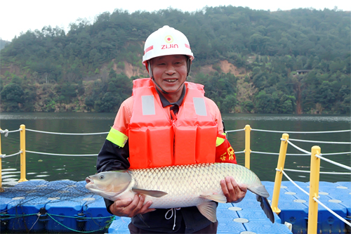 本网讯 近日,紫金山金铜矿对矿区汀江沿线5处生物监测点网箱鱼进行年度更换,共收网箱鱼约1500斤,其中最大一尾重达22斤。
