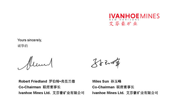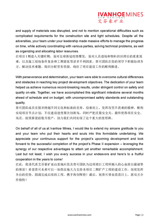 On behalf of all of us at Ivanhoe Mines, I would like to extend my sincere gratitude to you and your team who put their hearts and souls into this formidable undertaking. We appreciate your continuous support for the project’s upcoming development and look forward to the successful completion of the project’s Phase II expansion – leveraging the synergy of our respective advantages to attain yet another remarkable accomplishment. Last but not least, I wish you every success in your endeavors and here’s to a fruitful cooperation in the years to come!