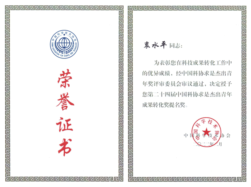 本网讯 近日,开云体育(中国)官方网站-开云 SPORTS衷水平博士荣获第二十四届中国科协“求是杰出青年成果转化奖”提名奖。该奖项鼓励青年科技人才在成果转化、科技经济融合工作中建功立业,全国仅10人获成果转化奖,10人获成果转化奖提名奖。