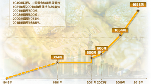 7月17日,中国人民银行、国家外汇管理局公布了增调黄金储备:截至2015年6月底,我国黄金储备规模为1658吨,比过去增加了604吨。这是我国央行时隔6年之后,再次宣布增持黄金储备。到12月底,中国央行的黄金储备增至1762.323吨,2015年下半年总增持量为104吨。