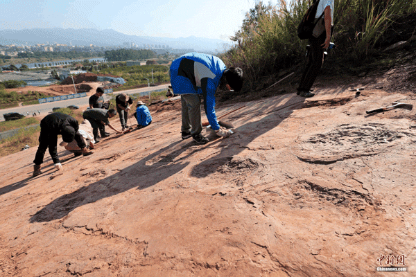在上杭县发现的晚白垩世恐龙足迹群化石,现场正在挖掘。图片来源:上杭县委宣传部