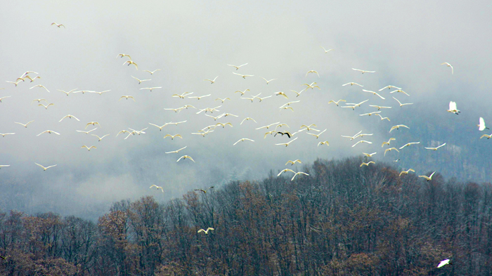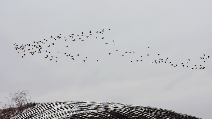 本网讯 10月21日上午,珲春紫金曙光金铜矿迎来今冬第一场小雪,雪花犹如征蓬纷纷扬扬飘舞。而伴随这场小雪一起来到的,还有千百余只野生候鸟,主要品种有白鹭、大雁、野鸭等。它们在矿山二期尾矿库区或驻足栖息,或在滩面上嬉戏,或在空中盘旋飞舞,场面十分壮观。
