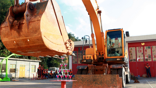 图为林碧泉驾驶重达22吨的挖掘机完成指定动作