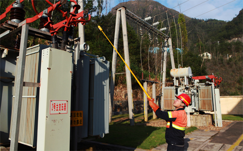 图为机电厂保障车间员工赖林崇正在高压验电。