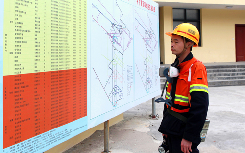 图为张志飞在下井前仔细阅读岗位告知风险牌