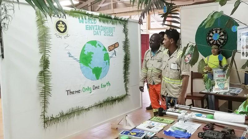 圭亚那奥罗拉金矿环保部门和营地志愿者张贴“世界环境日”主题海报,并组织签名和观影活动,倡导大家在日常生活中,通过“重复使用、减少浪费和回收利用”实现绿色低碳生活。