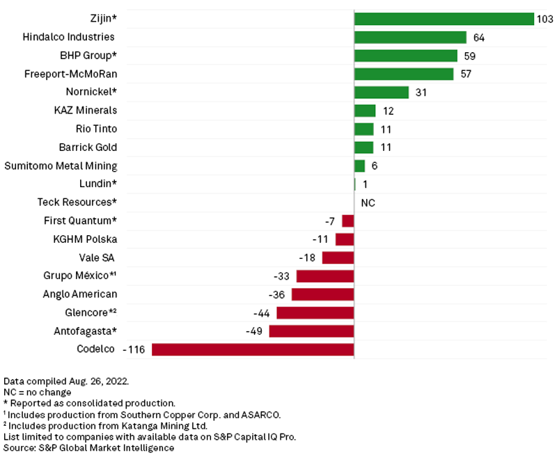 全球头部矿企二季度矿产铜量同比增减情况(千吨),来源:标普