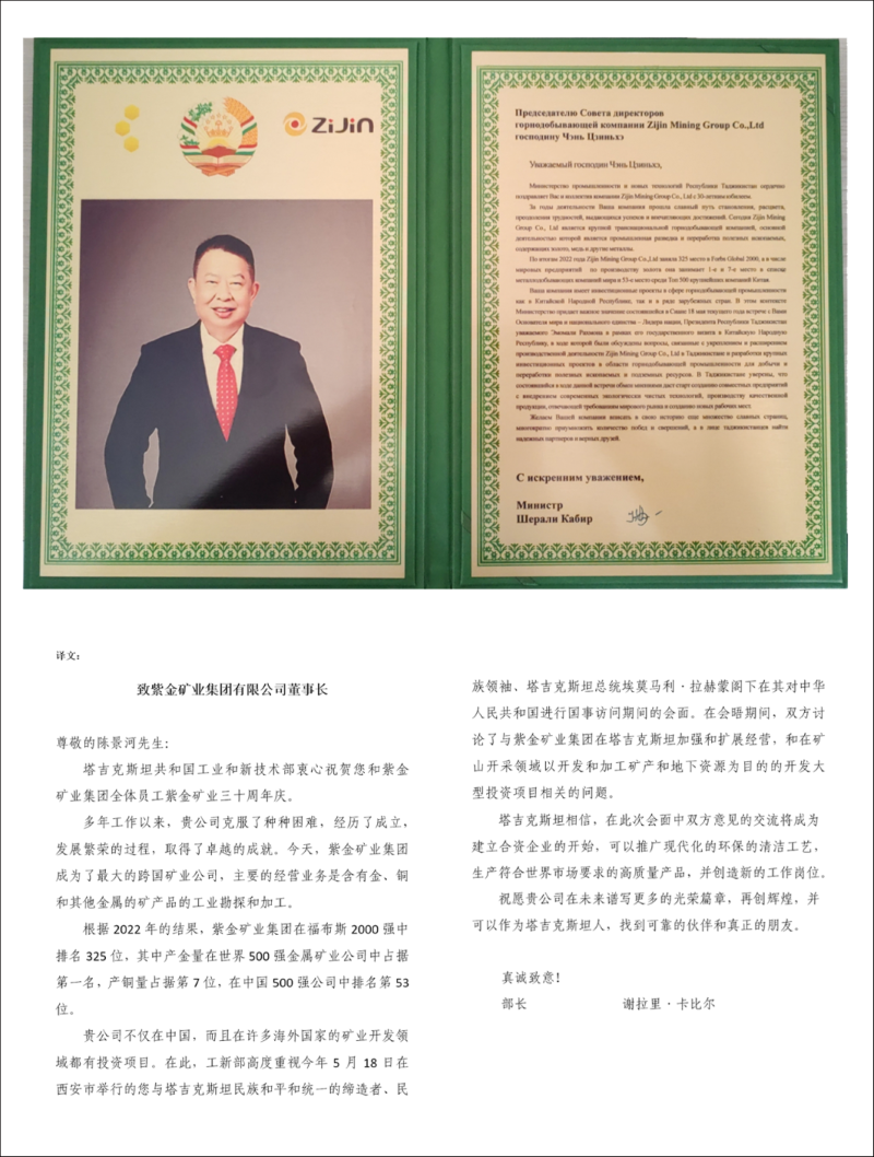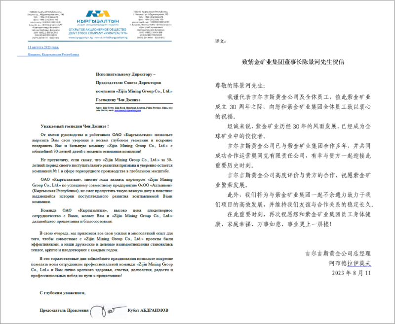 吉尔吉斯黄金公司总经理阿布德拉伊莫夫代表吉尔吉斯黄金公司及全体员工在贺信中向陈景河董事长及开云体育(中国)官方网站-开云 SPORTS全体员工致以衷心的祝福。