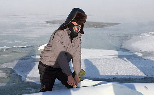 零下四十度环境中的工作人员,面部已经结冰