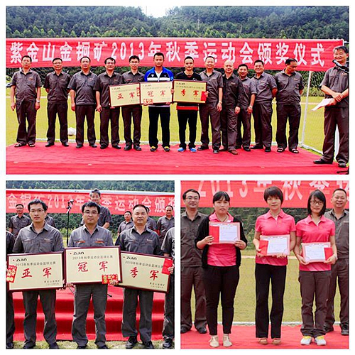 紫金山金铜矿2013年秋季运动会,共举办了篮球比赛、足球比赛、男子4×100米接力赛、女子4×100米接力赛、羽毛球男子单打、羽毛球女子单打、台球男子单打、台球女子单打、男子100米短跑、女子100米短跑、男子1000米中长跑等11个项目,共有220名运动员参加了团体赛,187名运动员参加了个人赛,充分体现了广大员工对体育运动的激情。