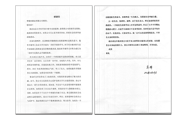 我是北京大学医学部口腔专业的蓝璘,获得贵公司的助学金资助,我感到非常的荣幸,对贵公司关心家乡教育事业、回报社会的善举深深地感动。