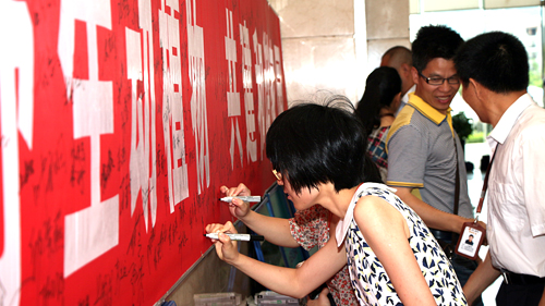 记者从现场签名点看到,活动现场热闹非凡,有的职工家长还带上了子女参与到活动中。