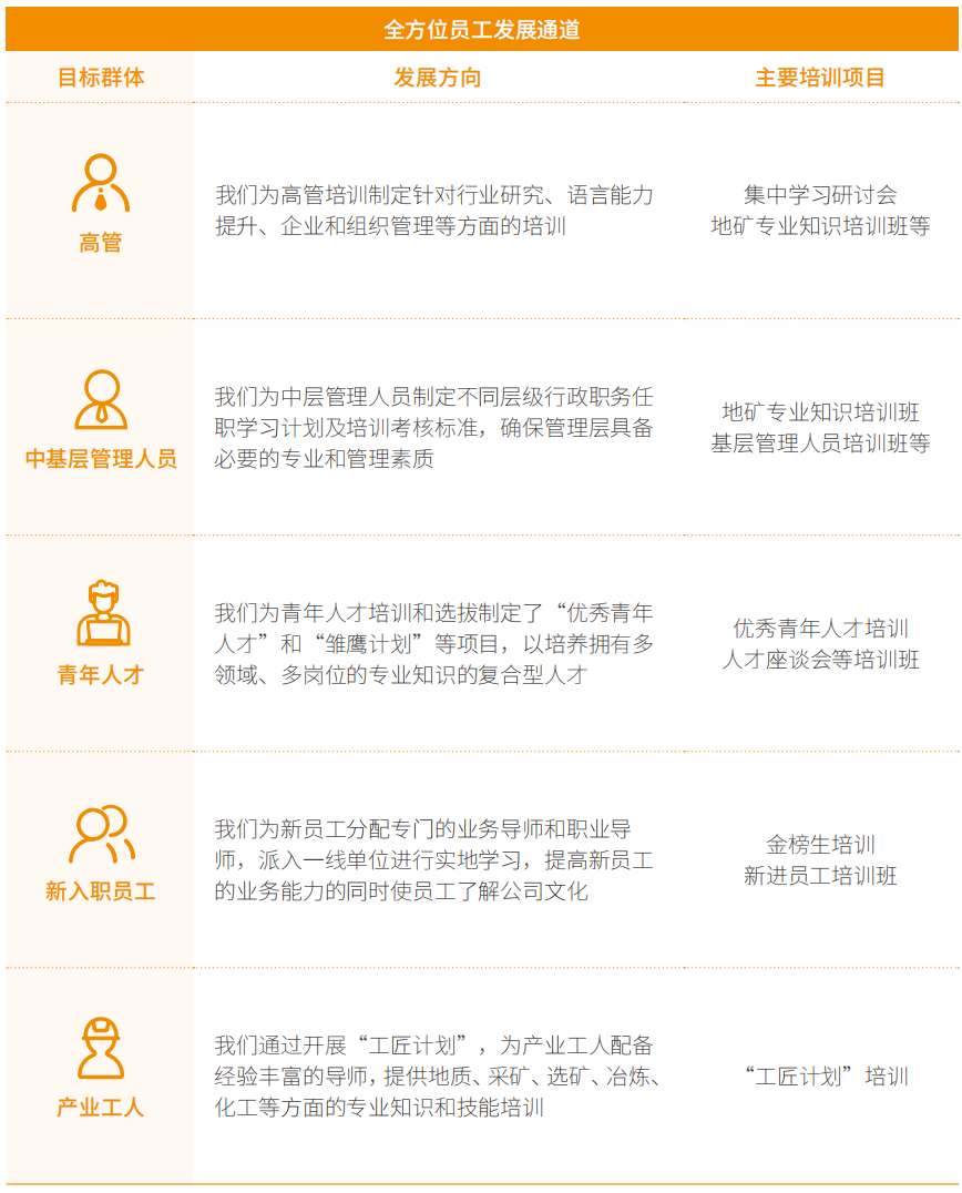 为应对国际化以及矿业人才稀缺的挑战,我们将多元化的用工政策与公司战略相结合,努力打造具有全球化视野、具备国际竞争力以及符合东道国利益的多元化的人才体系以及和人员结构。